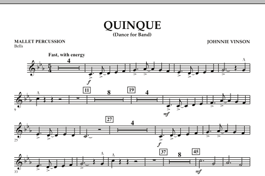 Quinque (the Latin word for five) is a great way to introduce the 5/4 meter to your young players. Consistently using a 3+2 rhythmic grouping through, the melodies and accompaniment figures are easy to learn. This piece features an appealing dance-like quality, lots of variety in scoring, plus tutti ensemble patterns with short feature spots for percussion. Dur: 2:35 (Grade 2)