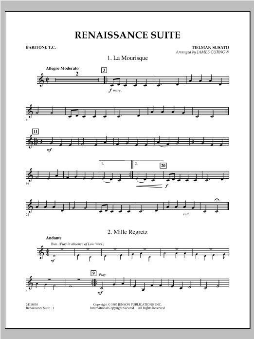 Here's a superb way to introduce your band to the joys of early instrumental music. Jim Curnow's well-conceived transcription is based on three 16th Century dances by Susato: I. Las Mourisque (Basse Danse), II. Mille regretz (Pavane), and III. La bataille (Pavane).