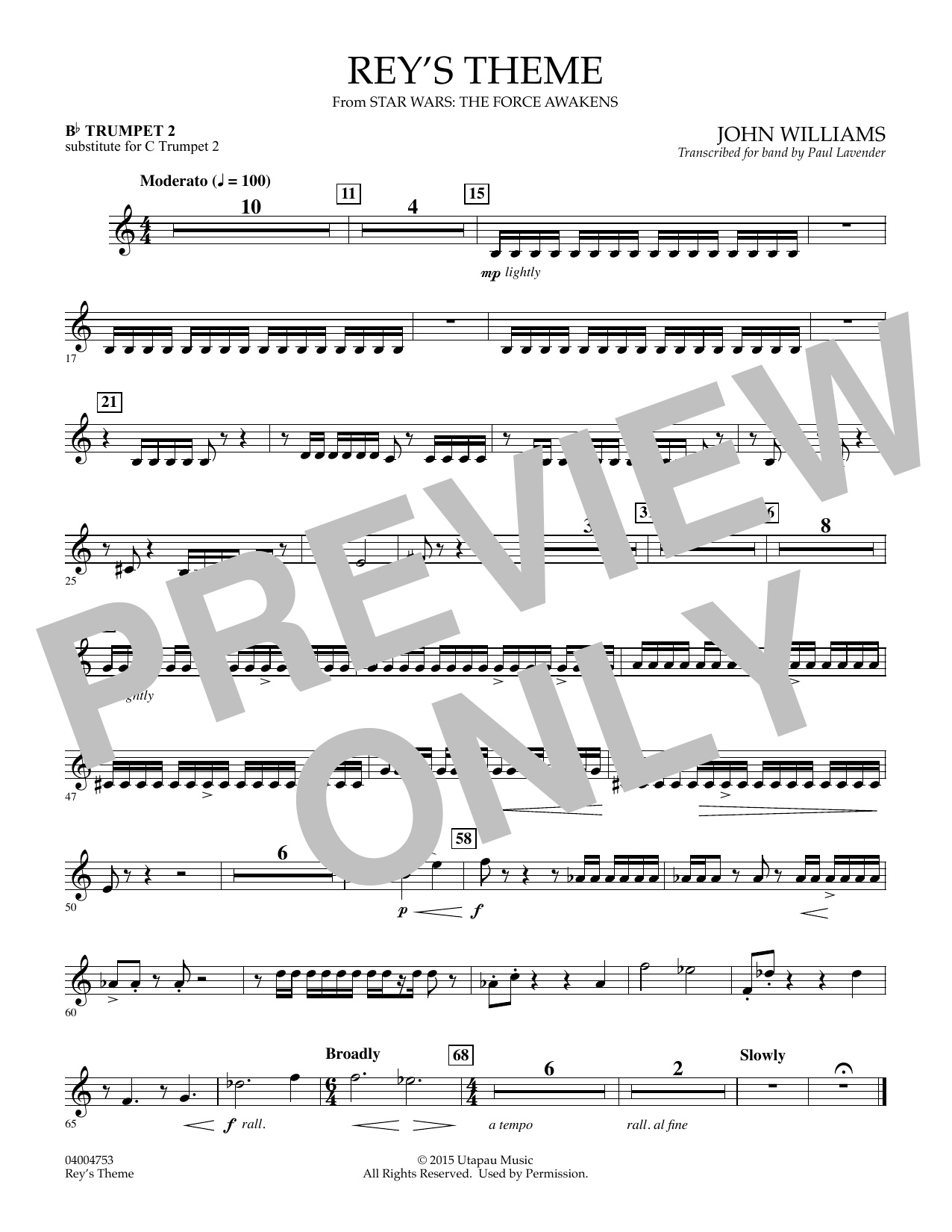 From the blockbuster 2015 film "Star Wars: The Force Awakens", here is the evocative and magical heroine theme that recurs throughout the movie. This beautiful and authentic transcription was performed by the United States Marine Band. The parts available here are substitute Bb Trumpet parts that may be used in place of the C Trumpet parts that are included in the full set.