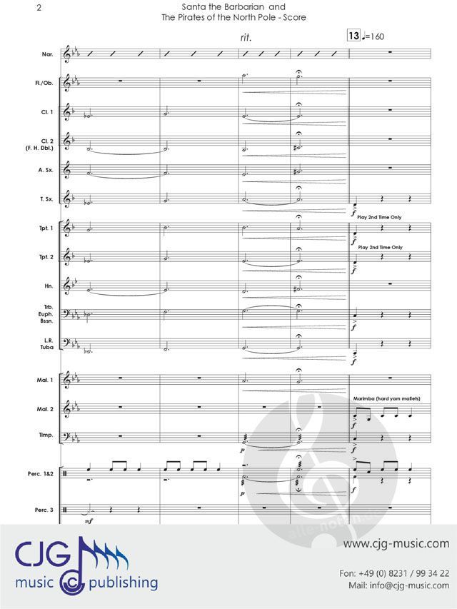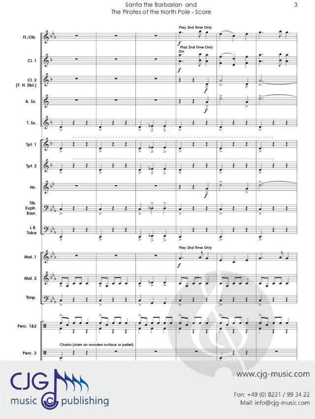 This feisty and festive holiday work finds our titular anti-hero taking to the seas to spread his brand of holiday mayhem. Written in a jaunty 3/4 time, Chapter 2 of the 'Santa the Barbarian Saga' evokes both yuletide cheer and danger on the high seas as our jolly old elf and his pirates pillage, plunder, and bring the spirit of the season to anyone unlucky enough to cross their paths. Incorporating numerous familiar tunes (Jolly Old St. Nicholas, I Saw Three Ships, Ukrainian Bell Carol, and more) into the style of seas chanties, this work for Narrator and Concert Band is sure to be the talk of your next winter concert! Rated ARRRRRRGH!