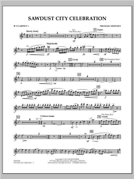 Commissioned by the Oshkosh (nickname Sawdust City) Area Community Band for their 25th anniversary, Sawdust City Celebration presents varied and creative settings of early American folk tunes commonly heard during Wisconsin's pioneer days. With styles ranging from dramatic and powerful to lighthearted and lyrical, this is a rich-sounding and impressive work for the concert stage. Dur: 5:50