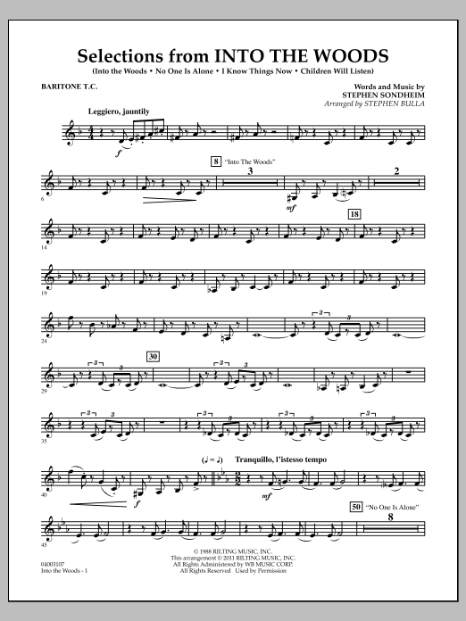 This landmark musical by Stephen Sondheim remains one of his most performed and popular shows. Using main characters from familiar fairy tales (Cinderella, Little Red Riding Hood, Jack and the Beanstock, and Rapunzel), the story line takes some unexpected twists and turns. Featuring memorable melodies from this award-winning production, Stephen Bulla's symphonic medley includes Into the Woods, No One Is Alone, I Know Things Now and Children Will Listen.
