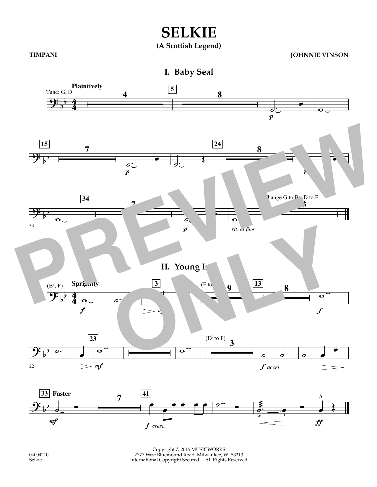 In Celtic folklore, a selkie is a mythical creature appearing as a seal in water, but taking human form on land. In this striking setting for second-year players the first movement, in a lyric and melancholy style, portrays the selkie as a baby seal. The second movement depicts a young boy on land and employs a number of characteristics of traditional Scottish folk tunes. This marvelous work provides opportunities for musical and cross-curricular exploration. Dur: 3:50