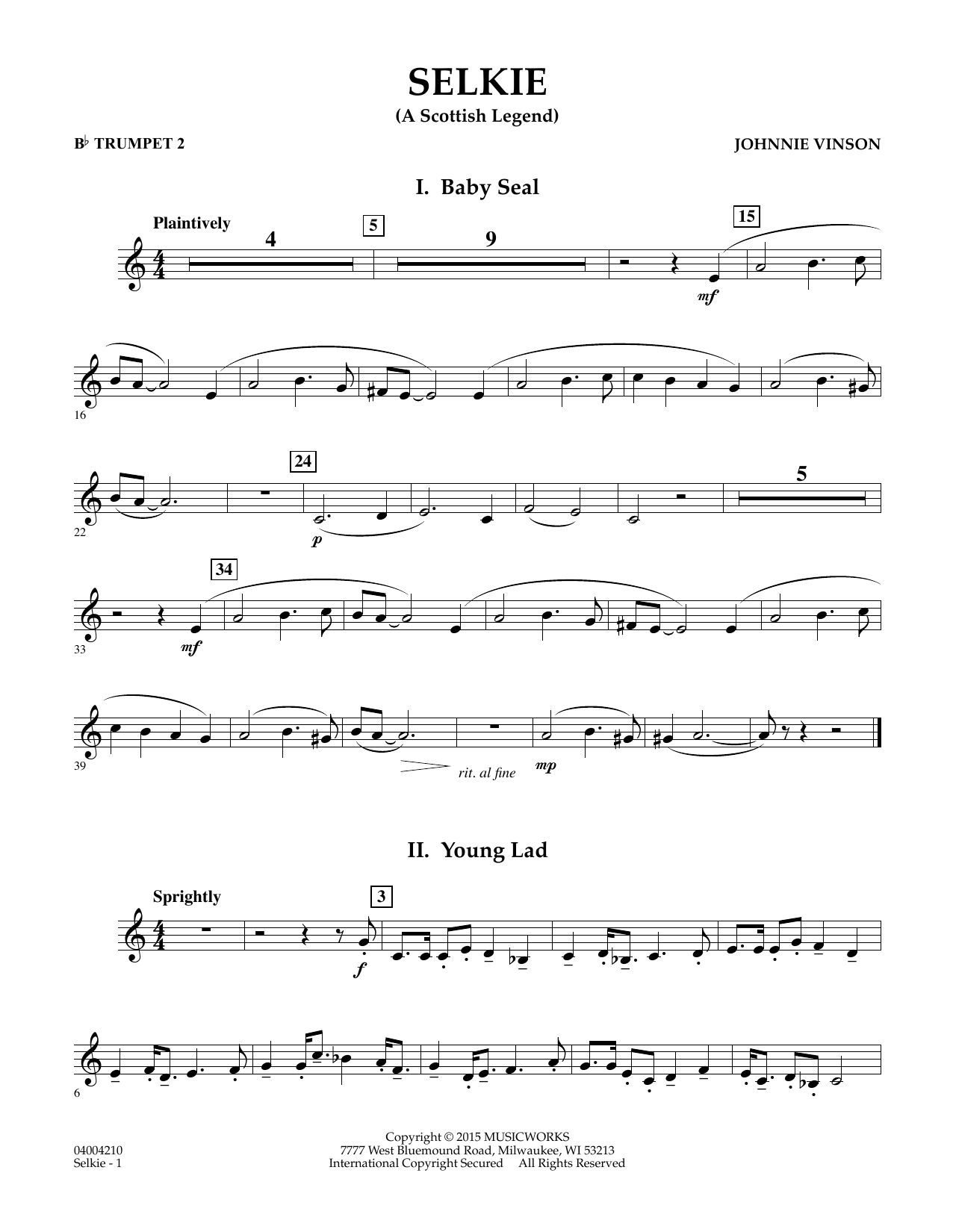 In Celtic folklore, a selkie is a mythical creature appearing as a seal in water, but taking human form on land. In this striking setting for second-year players the first movement, in a lyric and melancholy style, portrays the selkie as a baby seal. The second movement depicts a young boy on land and employs a number of characteristics of traditional Scottish folk tunes. This marvelous work provides opportunities for musical and cross-curricular exploration. Dur: 3:50