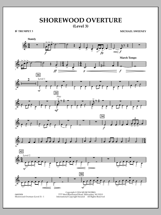 Combining a district-wide extravaganza for players of all levels creates an exciting spectacle for parents, while providing much needed incentives for the younger players. Shorewood Overture is specifically designed to be performed by multi-level bands and, rather than the typical massed band number where everyone plays at once, this ingenious overture allows each level to be featured briefly by itself, along with sections where everyone plays together. In addition, the Level 3 parts include cues (also in the Level 3 score) that allow the piece to be performed by a single ensemble. Dur: 4:20 Note: Level 2/Level 1 versions are not playable separately