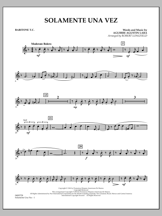 'Solamente Una Vez' von Augustin Lara ist auch bekannt unter dem Titel 'You Belong To My Heart' - oftmals mit englischem Text aufgenommen, beispielsweise von Nat King Cole oder auch Andrea Bocelli. Dieser Titel kommt hier als geschmeidiger Bolero daher - effektvoll arrangiert für Blasorchester von Robert Longfield. Die wunderschönen Harmonien gepaart mit dem mexikanischen Bolero-Groove werden ihre Zuhörer begeistern.