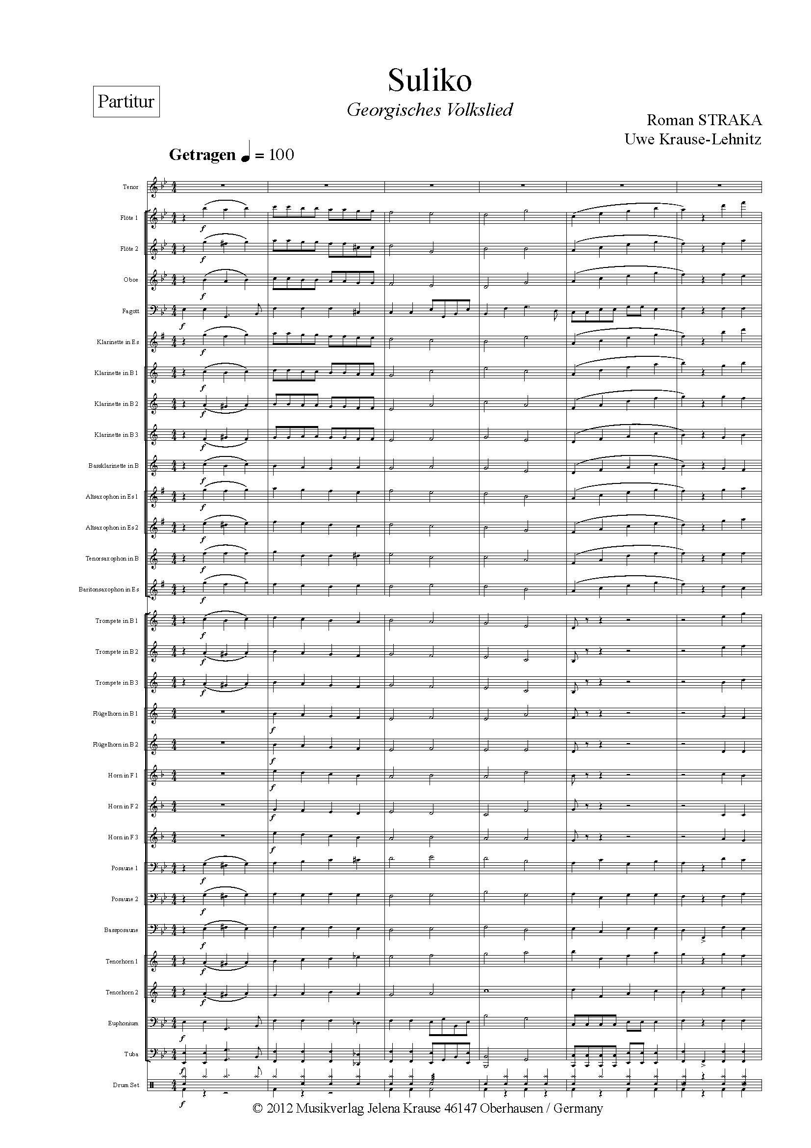 Suliko ist eine wunderschöne Bearbeitung des alten georgischen Volksliedes für Blasorchester. Diese einzigartige Version ermöglicht es, das Stück optional mit Gesang oder als Solo für 2 Flügelhörner und Blasorchester aufzuführen. Mit Suliko können Sie Ihr Repertoire erweitern und Ihren Zuhörern ein unvergessliches Musikerlebnis bieten. Tauchen Sie ein in die faszinierende Welt der georgischen Musik mit Suliko!