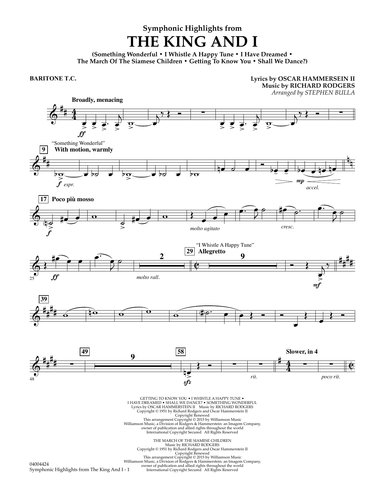 Opening on Broadway in 1951, and garnering multiple awards for the 2015 revival, few musicals can boast as many lasting and memorable songs as this Rodgers and Hammerstein masterpiece. Drawing on the classic orchestrations by Robert Russell Bennett, here is a fabulous medley for the symphonic stage. Includes: Something Wonderful, I Whistle a Happy Tune, I Have Dreamed, The March of the Siamese Children, Getting to Know You, and Shall We Dance?