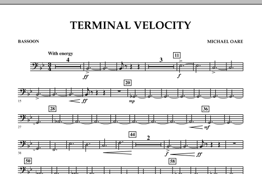 A term used in physics, 'terminal velocity' describes the point at which a falling object ceases to accelerate but continues to fall at a constant velocity. Inspired by the exhilaration of sky diving, this is an exciting and dynamic work for young bands, and fittingly composed all in one constant tempo. Dur: 2:20.