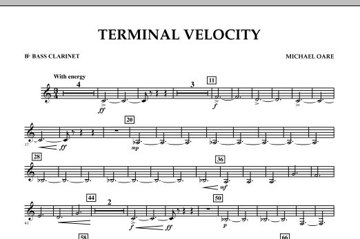 A term used in physics, 'terminal velocity' describes the point at which a falling object ceases to accelerate but continues to fall at a constant velocity. Inspired by the exhilaration of sky diving, this is an exciting and dynamic work for young bands, and fittingly composed all in one constant tempo. Dur: 2:20.