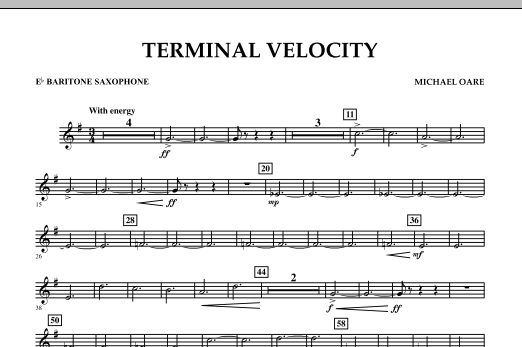 A term used in physics, 'terminal velocity' describes the point at which a falling object ceases to accelerate but continues to fall at a constant velocity. Inspired by the exhilaration of sky diving, this is an exciting and dynamic work for young bands, and fittingly composed all in one constant tempo. Dur: 2:20.