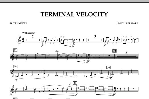 A term used in physics, 'terminal velocity' describes the point at which a falling object ceases to accelerate but continues to fall at a constant velocity. Inspired by the exhilaration of sky diving, this is an exciting and dynamic work for young bands, and fittingly composed all in one constant tempo. Dur: 2:20.