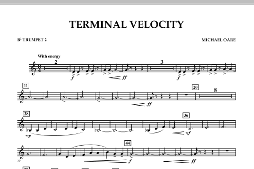 A term used in physics, 'terminal velocity' describes the point at which a falling object ceases to accelerate but continues to fall at a constant velocity. Inspired by the exhilaration of sky diving, this is an exciting and dynamic work for young bands, and fittingly composed all in one constant tempo. Dur: 2:20.