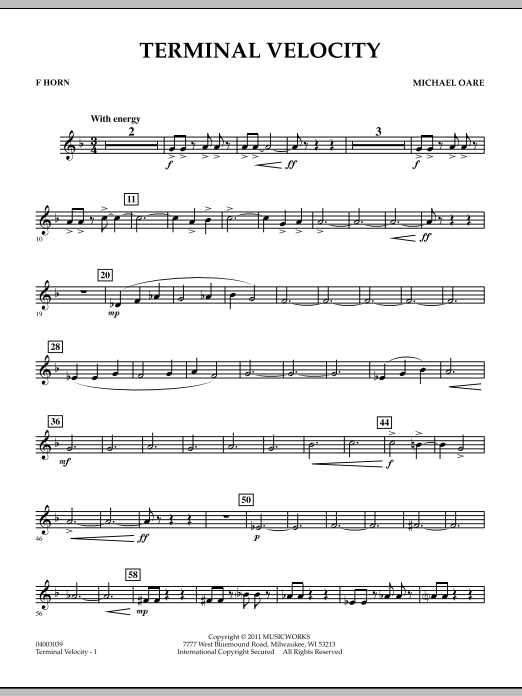 A term used in physics, 'terminal velocity' describes the point at which a falling object ceases to accelerate but continues to fall at a constant velocity. Inspired by the exhilaration of sky diving, this is an exciting and dynamic work for young bands, and fittingly composed all in one constant tempo. Dur: 2:20.