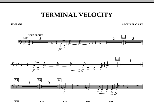 A term used in physics, 'terminal velocity' describes the point at which a falling object ceases to accelerate but continues to fall at a constant velocity. Inspired by the exhilaration of sky diving, this is an exciting and dynamic work for young bands, and fittingly composed all in one constant tempo. Dur: 2:20.