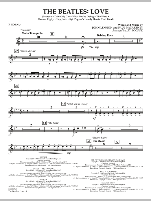 Created by famed Beatles producer George Martin along with his son Giles for the ambitious Cirque du Soleil Las Vegas show spectacular, the album Love utilizes original Beatles recordings recast in new and imaginative settings and mixes. Effectively adapted for the concert stage by Jay Bocook, this terrific medley features Because, Drive My Car, The Word, What You're Doing, Hey Jude and Sgt. Pepper's Lonely Hearts Club Band.