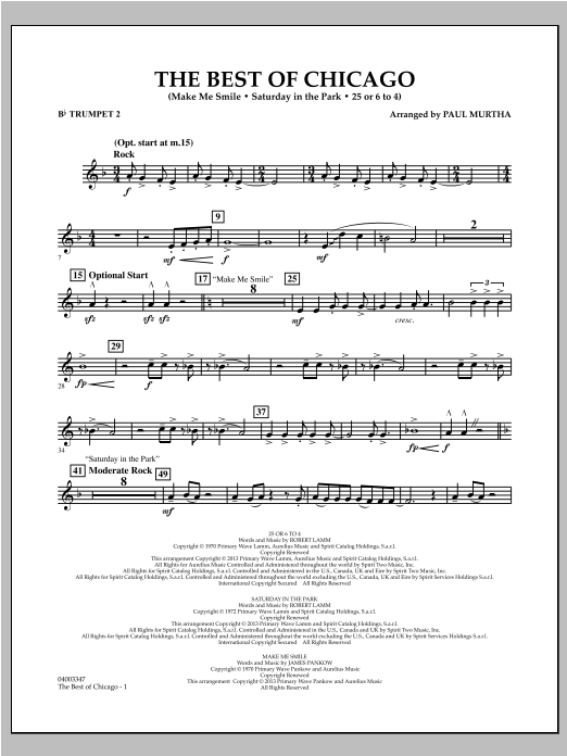 Die frühen Hits der Supergruppe Chicago zeichneten sich durch ihren treibenden Rockstil in Kombination mit einem unverwechselbaren und integralen Einsatz von Bläsern aus. Hier ist ein rasantes und dynamisches Medley für junge Spieler, das die bekannten Stücke Make Me Smile, Saturday in the Park und 25 oder 6 to 4 enthält.