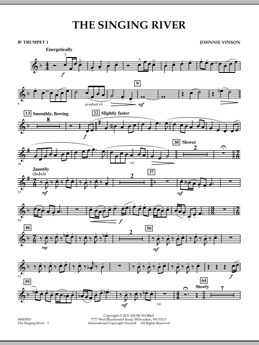 In the Shoals region of northwest Alabama, the Tennessee River is often referred to as the singing river, a term originating with the Yuchi tribe of Native Americans. Commissioned by the Shoals Area Band Directors Association, Johnnie Vinson has created an effective work for band that focuses on the river's relationship to life in this area both past and present. A primary river theme is stated from which a series of variants creates a fascinating and appealing musical tapestry. Dur: 5:40.