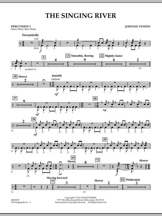 In the Shoals region of northwest Alabama, the Tennessee River is often referred to as the singing river, a term originating with the Yuchi tribe of Native Americans. Commissioned by the Shoals Area Band Directors Association, Johnnie Vinson has created an effective work for band that focuses on the river's relationship to life in this area both past and present. A primary river theme is stated from which a series of variants creates a fascinating and appealing musical tapestry. Dur: 5:40.