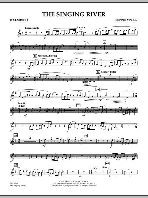 In the Shoals region of northwest Alabama, the Tennessee River is often referred to as the singing river, a term originating with the Yuchi tribe of Native Americans. Commissioned by the Shoals Area Band Directors Association, Johnnie Vinson has created an effective work for band that focuses on the river's relationship to life in this area both past and present. A primary river theme is stated from which a series of variants creates a fascinating and appealing musical tapestry. Dur: 5:40.