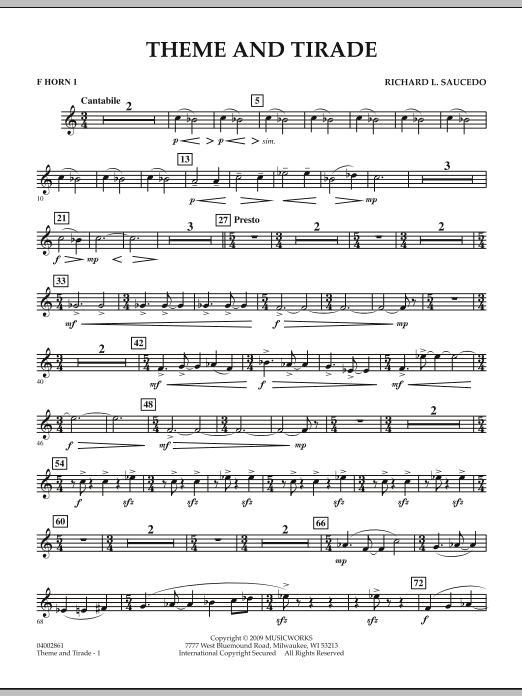 The opening of this unique work features a gentle and serene theme traded between clarinet, oboe and trumpet soloists played over a lush harmonic background. The mood shifts abruptly, however, as the tirade begins! A predominant timpani pattern helps propel this section through a series of angular passages, driving rhythmic figures, a jazz-tinged clarinet solo, and ultimately blossoming into a triumphant and glorious conclusion. Dur: 3:30 (Grade 3-1/2)