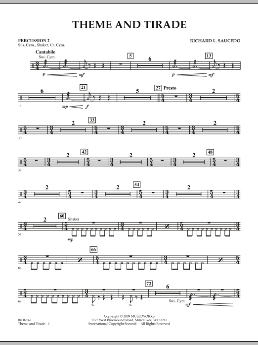 The opening of this unique work features a gentle and serene theme traded between clarinet, oboe and trumpet soloists played over a lush harmonic background. The mood shifts abruptly, however, as the tirade begins! A predominant timpani pattern helps propel this section through a series of angular passages, driving rhythmic figures, a jazz-tinged clarinet solo, and ultimately blossoming into a triumphant and glorious conclusion. Dur: 3:30 (Grade 3-1/2)