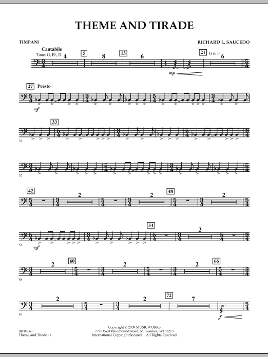 The opening of this unique work features a gentle and serene theme traded between clarinet, oboe and trumpet soloists played over a lush harmonic background. The mood shifts abruptly, however, as the tirade begins! A predominant timpani pattern helps propel this section through a series of angular passages, driving rhythmic figures, a jazz-tinged clarinet solo, and ultimately blossoming into a triumphant and glorious conclusion. Dur: 3:30 (Grade 3-1/2)
