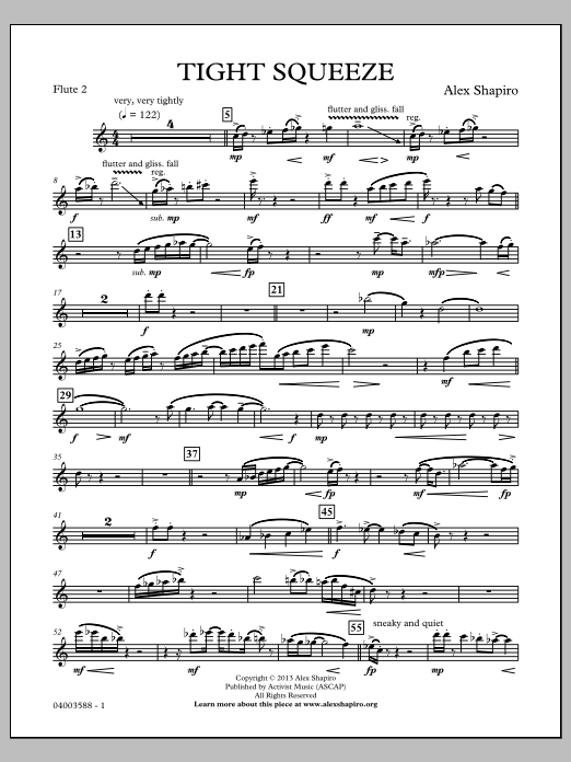 From the acclaimed composer of Paper Cut, AlexªShapiro, this unique, high-energy work could beªdescribed by the following: imagine Arnold Schoenberg, ªHenry Mancini, and Charlie Parker walking into aªdance club in Havana, and staying for three minutes. Tight Squeeze ventures into new territory as it exploresªchromaticism and syncopation against a prerecordedªpercussion groove. The result is the repertoire's first electroacousticªtwelve-tonetechno Latin bebop band piece! Okay, maybe Schoenbergªdid all that first, but it never sounded quite like this!