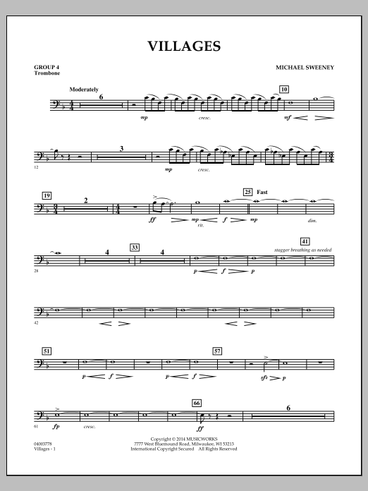 Calling for the band to be divided into four separate ensembles (and spread apart if space permits), Villages explores a wide range of harmonic and rhythmic interplay between each of these musical villages. The opening creates a dense canopy of sound, out of which the unique identity of each group variously emerges then melts back into the texture. As the fast pace continues, melodic fragments are bounced from group to group with interjections from the percussion. A slower lyric section provides contrast before the frantic pace returns leading to the exciting conclusion. Innovative in its conception, this stunning work will expose your students and audience to dramatically new sounds for band! Dur: 8:15