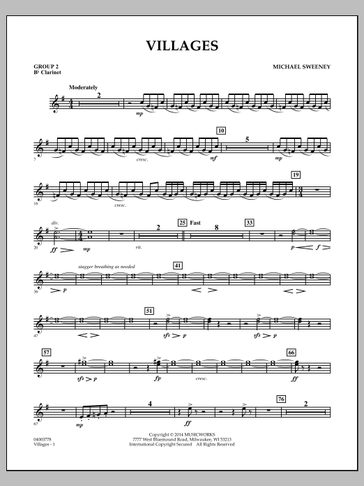 Calling for the band to be divided into four separate ensembles (and spread apart if space permits), Villages explores a wide range of harmonic and rhythmic interplay between each of these musical villages. The opening creates a dense canopy of sound, out of which the unique identity of each group variously emerges then melts back into the texture. As the fast pace continues, melodic fragments are bounced from group to group with interjections from the percussion. A slower lyric section provides contrast before the frantic pace returns leading to the exciting conclusion. Innovative in its conception, this stunning work will expose your students and audience to dramatically new sounds for band! Dur: 8:15