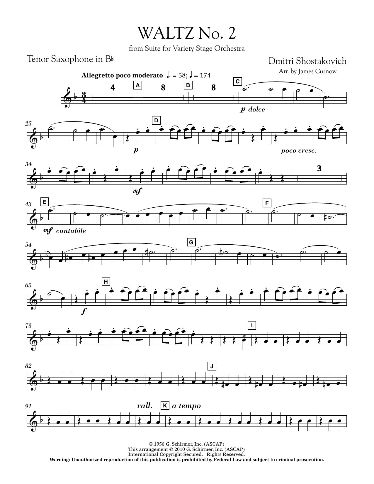 Originally misidentified as the lost Suite for Jazz Orchestra, No. 2, Shostakovich's Suite for Variety Stage Orchestra is notable for the addition of saxophones, accordion and guitar to the typical symphony orchestra instrumentation. The appealing second waltz is in a light classical style and is wonderfully adapted for young concert bands in this arrangement by James Curnow. (Grade 3)
