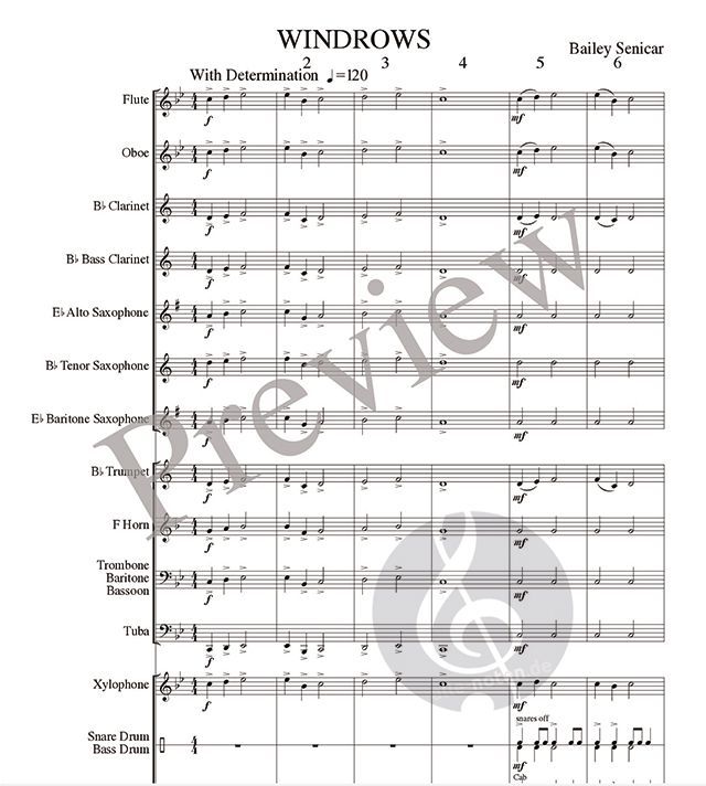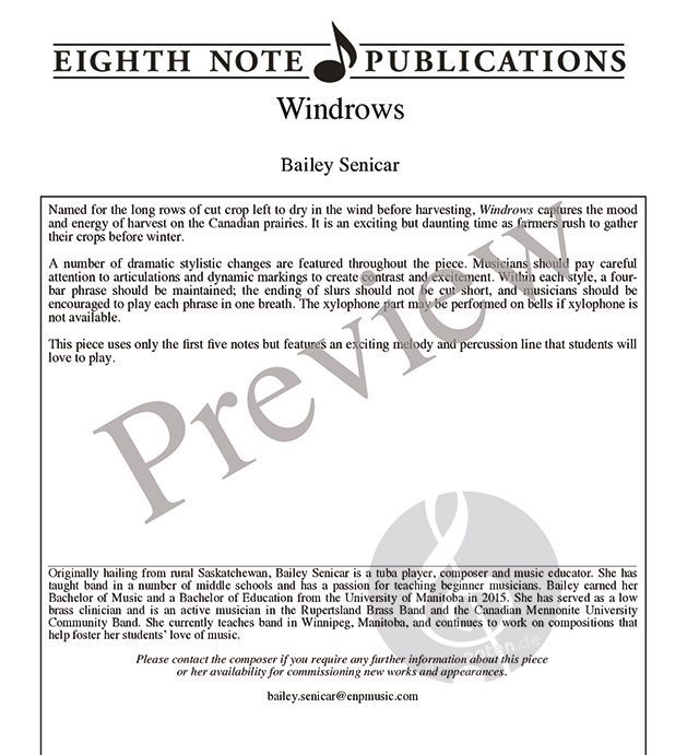 Windrows are a long row of cut grains left to dry in the wind before harvesting. Harvest on the Canadian prairies is both an exciting and daunting time as farmers race to harvest their crops before winter. This piece hopes to capture the mood and energy of this time of year. This piece uses only the first five notes but features an exciting melody and percussion line that students will love to play.Â