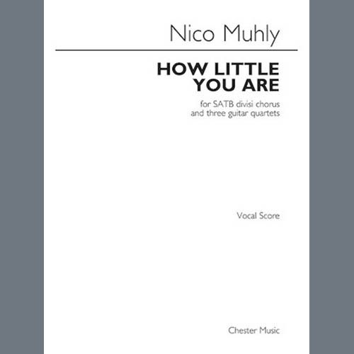 Nico Muhly's How Little You Are was composed in 2015 and is arranged for SATB divisi chorus and three Guitar quartets. Based on Cowboy Poetry texts, the work masterfully weds guitar and vocal textures...