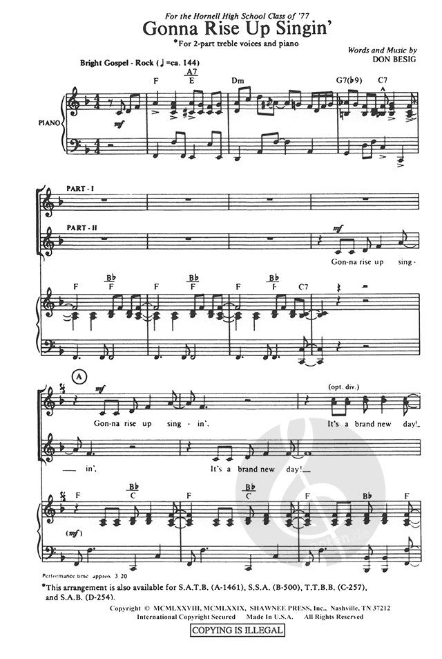 SA arrangement for this classic song. Also available for SAB and SATB.
