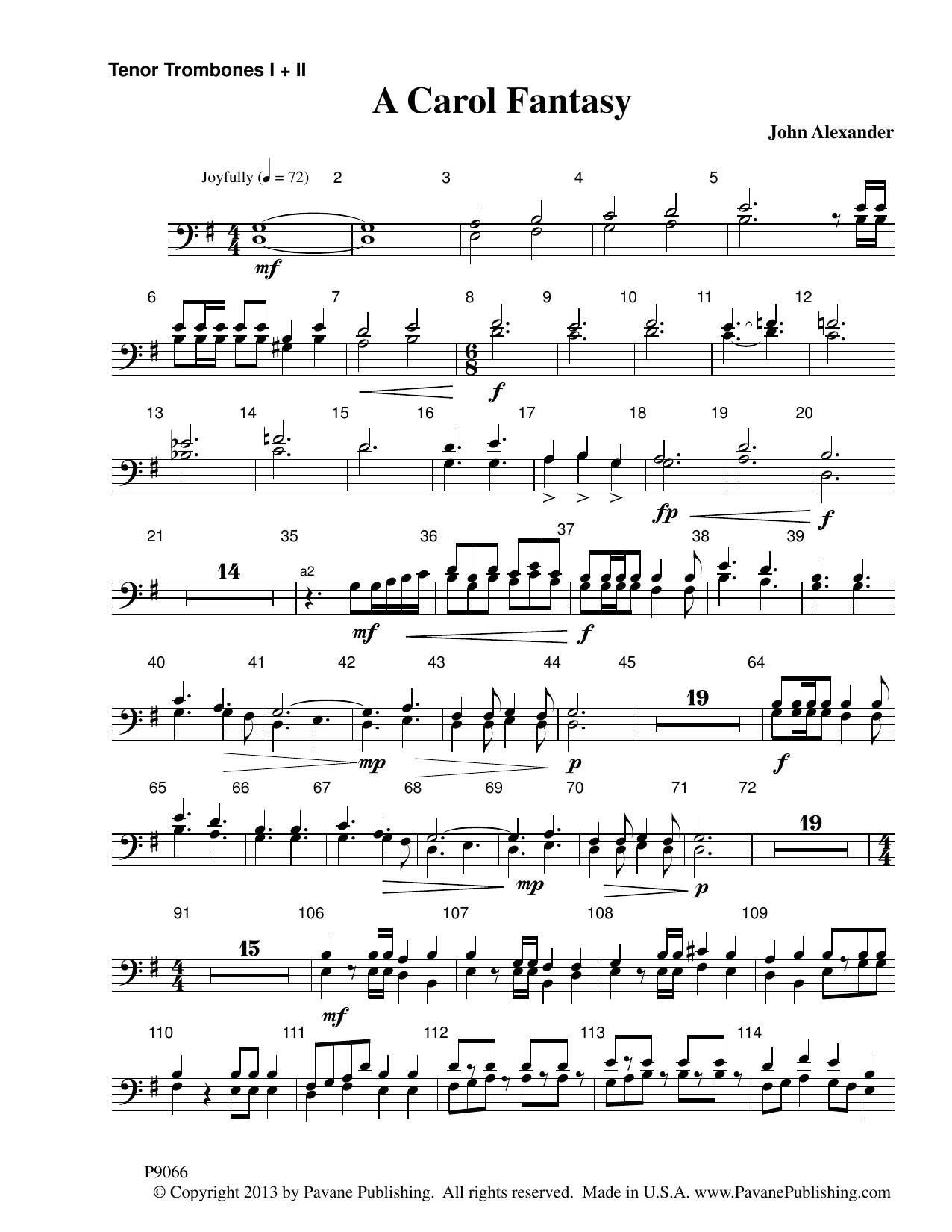 Want a Christmas Concert opener or closer to dazzle your audience? John Alexander's A CAROL FANTASY hits the mark. Never has an arrangement of In Dulci Jubilo been so exhilarating. There's even a dash of Personet Hodie thrown in. The instrumentation for Brass, Timpani, Percussion, Harp and Organ adds power and punch.