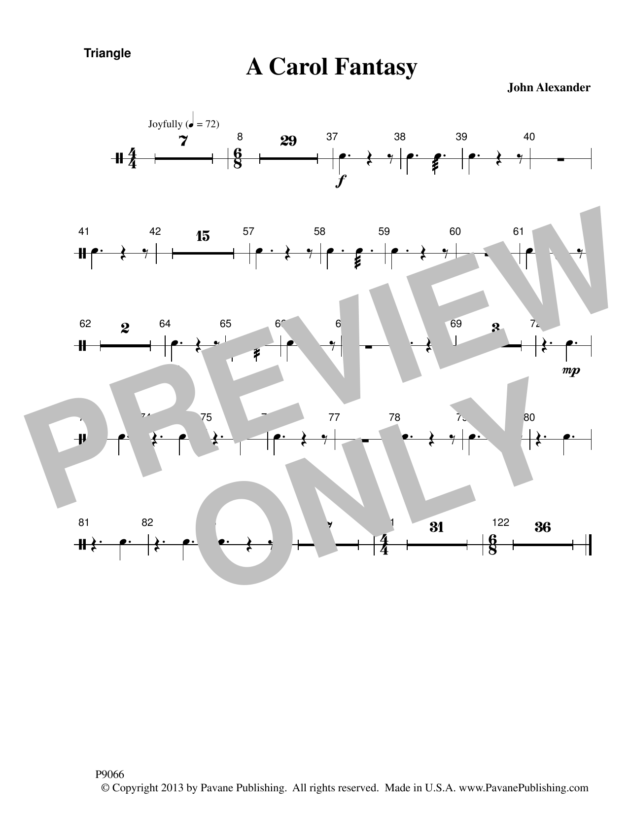 Want a Christmas Concert opener or closer to dazzle your audience? John Alexander's A CAROL FANTASY hits the mark. Never has an arrangement of In Dulci Jubilo been so exhilarating. There's even a dash of Personet Hodie thrown in. The instrumentation for Brass, Timpani, Percussion, Harp and Organ adds power and punch.