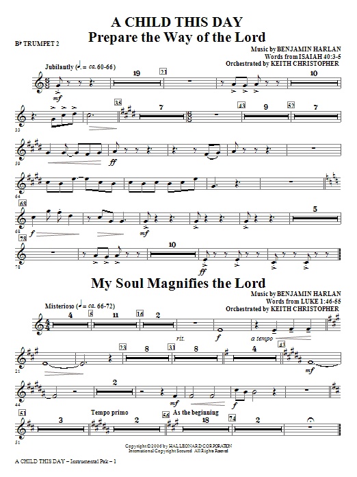 The triumphant opening Prepare the Way of the Lord sets the tone for this joyous and celebratory Christmas cantata. A children's choir is featured in two sections, bringing innocence and simplicity to the telling of the story. It displays some of Harlan's best writing and truly a signature work.