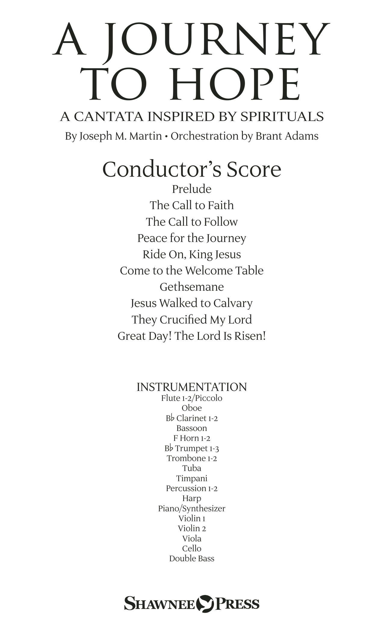 This major sacred work is musically inspired by traditional spirituals and tells of the ministry, passion and resurrection of Jesus through familiar repurposed tunes, narration and scriptures. Two endings are provided, one for Holy Week and one with a jubilant Easter finale, making this a versatile and inspiring work for a variety of Spring programming. From the rhythmic vitality of Ride On, King Jesus to the languishing strains of They Crucified My Lord, from the stately dignity of Give Me Jesus to the festive joy of Great Day, this work delivers both ministry and artistry. Whether presented with Brant Adams' inspired orchestrations, or with piano alone, you will find AJourney to Hope a unique and effective cantata experience. Songs include: Prelude - The Call to Faith - The Call to Follow - Peace for the Journey - Ride On, King Jesus - Come to the Welcome Table - Gethsemane - Jesus Walked to Calvary - They Crucified My Lord - Great Day! The Lord Is Risen! FULL ORCHESTRATION: Score and Parts (fl 1-2, ob, cl 1-2, bn, hn 1-2, tpt 1-3, tbn 1-2, tba, hp, pno, timp, perc 1-2, vn 1-2, va, vc, db) available as a Printed Edition and on CD-ROM. CONSORT ORCHESTRATION: Score and Parts (fl 1-2, cl, tpt 1-2, tbn, perc, kybd strings) available on CD-ROM.