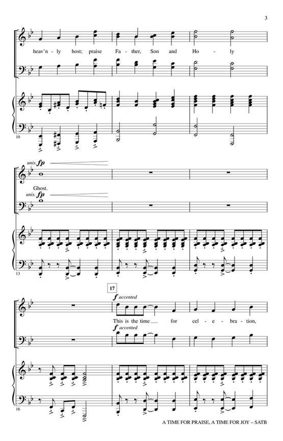 Uses: General, Call to Worship Scripture: Ecclesiastes 3:1; Psalm 69:30; Psalm 150 The title says it all! This anthem of worship and praise is filled to the brim with jubilation and the spirit of celebration. Rhythmically engaging and melodically compelling, the driving allure of this piece is undeniable. Walking the line between traditional and contemporary, this is an ideal choice for blended music programs. Score and Parts (fl 1-2, ob, cl 1-2, bn, tpt 1-3, hn, tbn 1-2, tbn 3/tba, perc 1-2, timp, hp, vn 1-2, va, vc, db) available on CD-ROM.