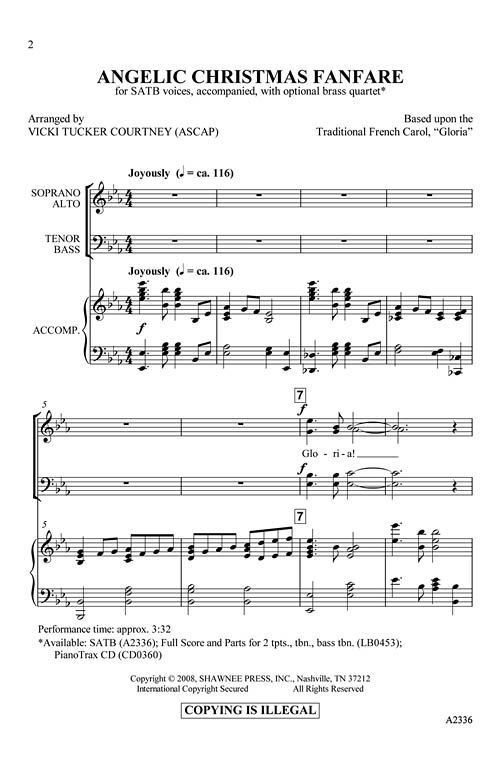 The beginning and ending fanfare sets the tone for an exciting arrangement by Vicki Tucker Courtney of the well-known French carol, Gloria. A syncopated accompaniment along with the vocal meter change from 4/4 to 6/8 in the chorus creates energy throughout the music. The original chorus transitions to the familiar chorus building to a triumphant ending. The available brass ensemble parts add power and finesse.