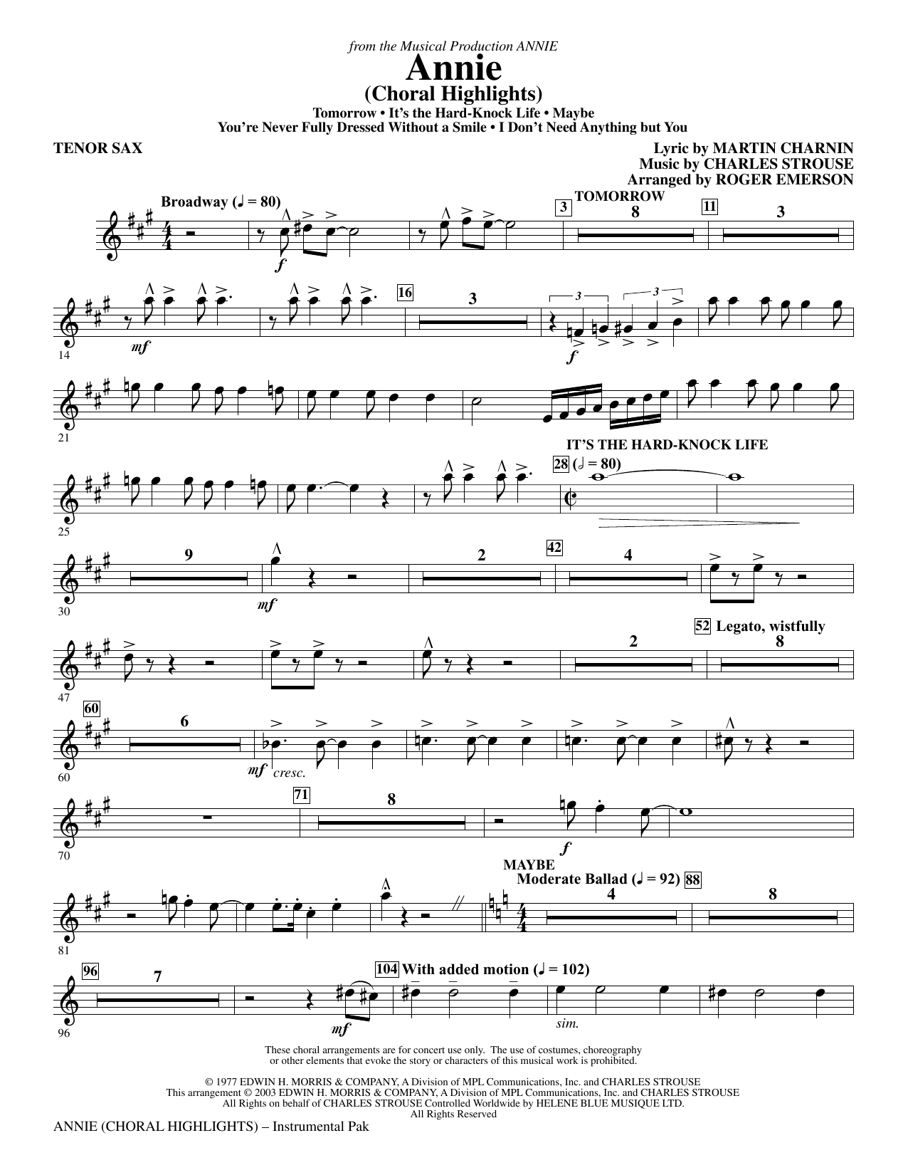 She's America's sweetheart! Perform this delightful 7-minute medley in your next concert. Includes: I Don't Need Anything But You, It's the Hard-Knock Life, Maybe, You're Never Fully Dressed Without a Smile, Tomorrow. Available: SATB, SAB, 2-Part, IPak (Flute, Clarinet, Trumpet I & II, Tenor Sax, Trombone, Synthesizer, Guitar Bass, Drums and Timpani/Bells), ShowTrax CD. Approx. Time: 7:00.