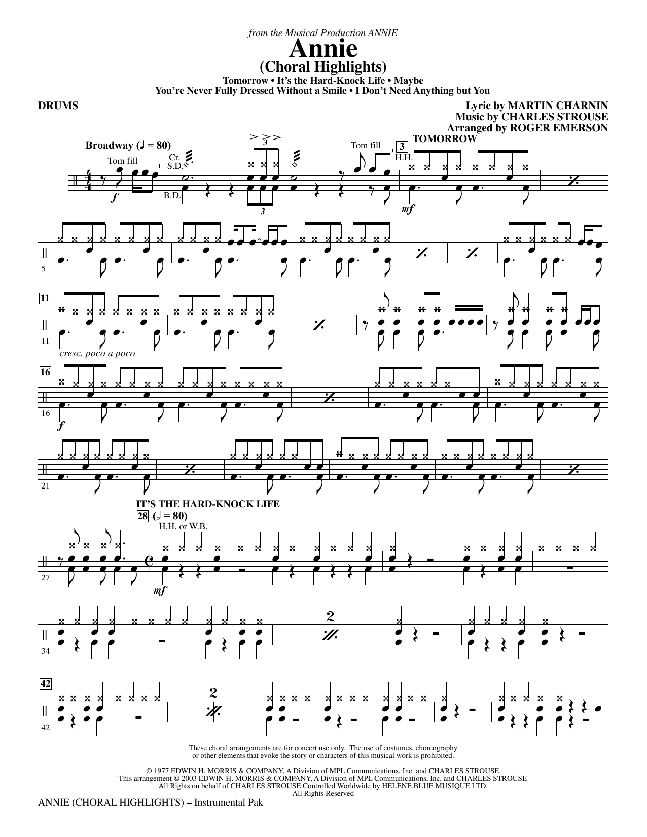 She's America's sweetheart! Perform this delightful 7-minute medley in your next concert. Includes: I Don't Need Anything But You, It's the Hard-Knock Life, Maybe, You're Never Fully Dressed Without a Smile, Tomorrow. Available: SATB, SAB, 2-Part, IPak (Flute, Clarinet, Trumpet I & II, Tenor Sax, Trombone, Synthesizer, Guitar Bass, Drums and Timpani/Bells), ShowTrax CD. Approx. Time: 7:00.