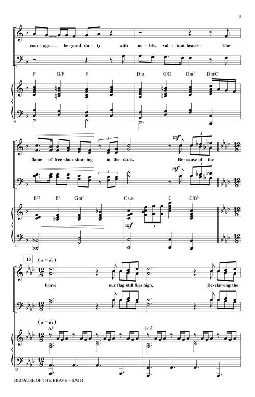 What an encouraging message for any patriotic program. Because of the brave, our flag still flies high. We are the land of the free because of the brave. Available separately: SATB, ChoirTrax CD, DVD Trax. Score and parts (fl 1-2/pic, ob, cl 1-2, tpt 1-3, hn 1-4, tbn 1-2, tbn 3/tba, perc 1-2, hp, dm, b, vn 1-2, va, vc, db). Duration: ca. 3:30