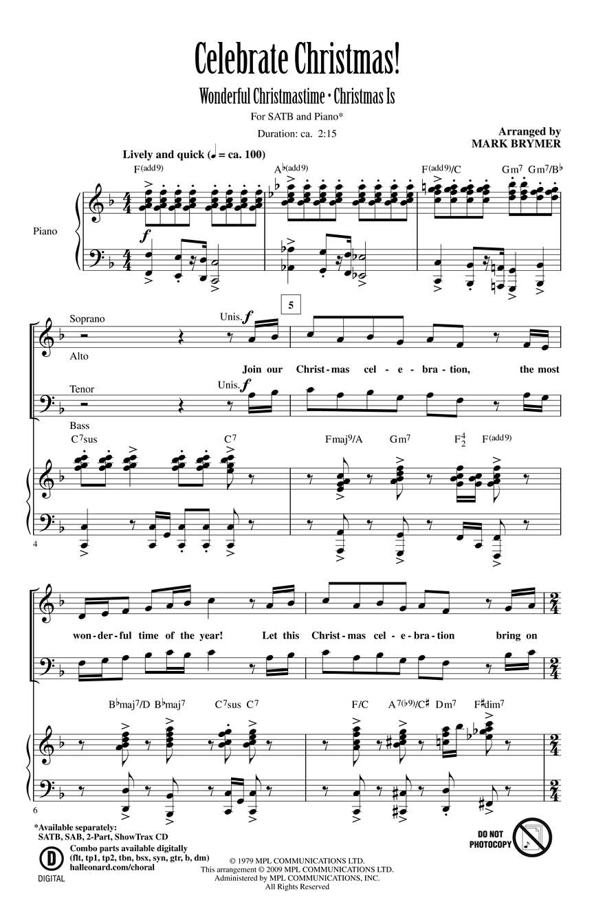 You'll set the perfect festive mood with this fresh pairing of two Christmas classics! Easily learned, it makes a jubilant holiday opener and includes: Christmas Is, Wonderful Christmastime. Available separately: SATB, SAB, 2-Part, ShowTrax CD. Duration: 2:15.