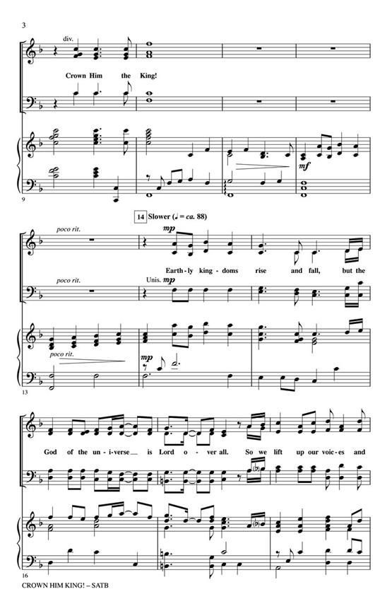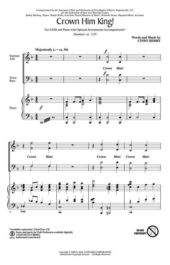 Cindy Berry's new anthem of rejoicing is upbeat, rhythmic and exciting and will lead your congregation to praise for the King. Available separately: SATB, ChoirTrax CD. Score and parts for Full Orchestra available digitally (1110/1321/11/1/88442). Duration: ca. 3:55.