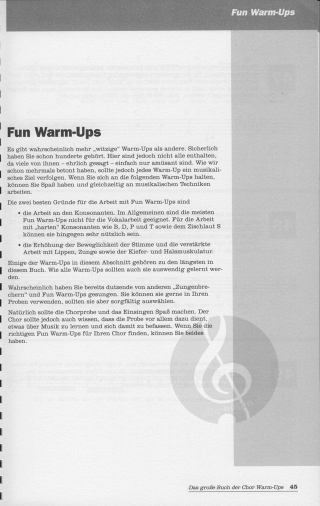 Eine umfassende Sammlung von Einsing- und Aufwärmübungen mit Praxisanleitung. Für Chorleiter von Kinder-, Jugend-, Schul-, Erwachsenen- und Kirchenchören, 120 S., dt.