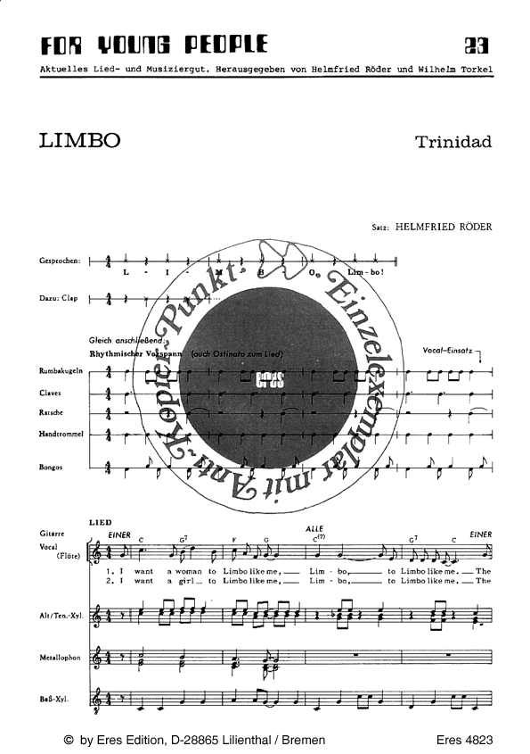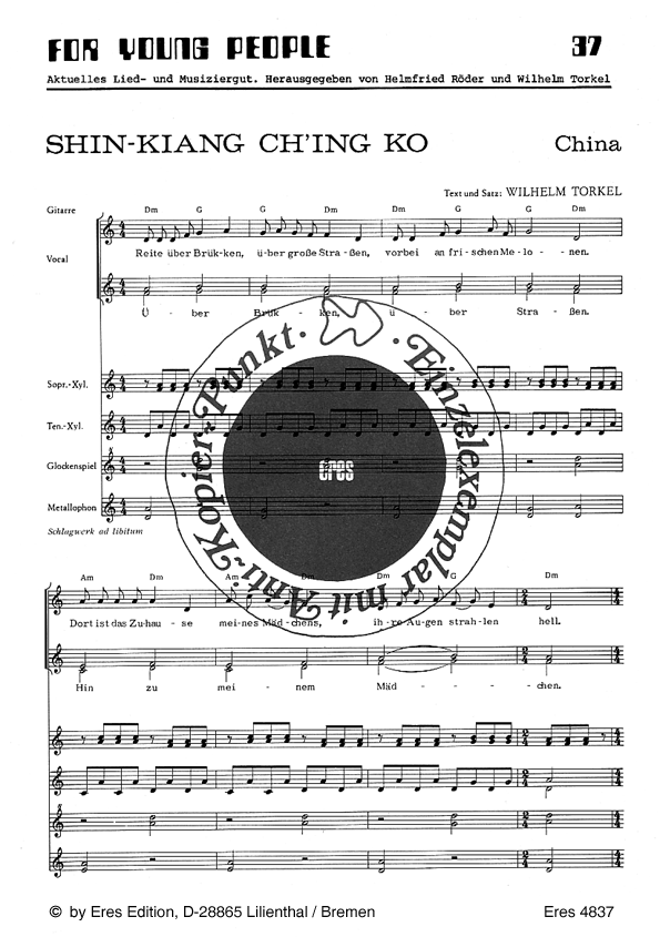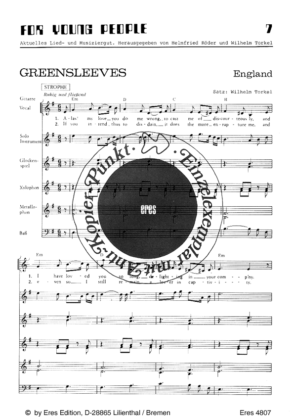 For Young People56 Chorsätze für 1- 3 gleiche Stimmen, Folklore aus aller Welt. Viele in Orginalsprache, meistens mit Instrumentalmbegleitung.Die nachstehenden Lieder werden zusammen mit methodisch-praktischen Hinweisen als Sammelband geliefert. Die Noten sind mit einem Anti-Kopier-Punkt ausgestattet.Jeder der Titel ist als Einzelausgabe (dann ohne Kopierschutz) lieferbar, Mindestbestellmenge pro Titel 20 Exemplare.Titel Bearbeiter Besetzung Best.-Nr.Temporal (Puerto Rico) H. Röder SSA+Instr. eres 4801 She'll Be Comin'Round The Mountain (USA) W. Torkel SSA+Instr. eres 4803 Joshua Fit The Battle (USA) W. Torkel SSA+Instr. eres 4804 The Drunken Sailor (England) W. Torkel SSA+Instr. eres 4806 Greensleeves (England) W. Torkel SSA+Instr. eres 4807 Einem iz doch zeyer gut (Jiddisch) H. Röder SSA+Instr. eres 4808 Nah am Fluss (Russland) H. Röder SSA+Instr. eres 4809Dunaj Iwaniwitsch (Russland) H. Röder SSA+Instr. eres 4810 Ev'rybody Loves Saturday Night (Afrika) M. Weichert SSA+Instr. eres 4811 The House Of The Rising Sun (USA) H. Röder SSA+Instr. eres 4812 Old Ark's A-Movering (USA) W. Torkel SSA+Instr. eres 4813 There's A Meeting Here Tonight (USA) W. Torkel SSA+Instr. eres 4814 Drill, Ye Tarriers, Drill (USA) W. Torkel SSA+Instr. eres 4815 Hava netse b' machol (Israel) H. Röder SSA+Instr. eres 4816 Bay mayn Rebn (Jiddisch) M. Weichert SSA+Instr. eres 4817 Der Karneval (Griechenland) W. Torkel SSA+Instr. eres 4819Oshima (Japan) H. Röder instrument. eres 4820 Amazing Grace (USA/Schottland) W. Torkel SSA+Instr. eres 4821 Limbo (Trinidad) H. Röder SSA+Instr. eres 4823 Nobody's Business (Jamaika) H. Röder SSA+Instr. eres 4824 Kunz von Kaufungen (Deutschland) H. Röder S+Instr. eres 4826 Lieber Regen (Griechenland) W. Torkel S+Instr. eres 4827 Üsküdar (Türkei) H. Röder SSA+Instr. eres 4828 Sakura (Japan) W. Torkel SSA+Instr. eres 4829 Hochzeitstanz der Männer (Tunesien) W. Torkel instrument. eres 4830 Tanz den Vito (Spanien) H. Röder SSA+Instr. eres 4831 Rosmarien (Brasilien) H. Röder SSA+Instr. eres 4832 Troika (Russland) H. Röder SSA a capp. eres 4833 Du Meine (Ägypten) H. Röder S+Instr. eres 4834 Horch, was kommt von draussen rein (P. Riedel) SSA a capp. eres 4835 Hoch auf dem gelben Wagen (neue Melodie) P. Riedel SA a capp. eres 4836 Shin-kiang ch'ing ko (China) W. Torkel SSA+Instr. eres 4837 Porque me dises chorando (Portugal) W. Torkel SSA+Instr. eres 4838 Baadn laat (Norwegen) W. Torkel SSA a capp. eres 4839 Ariang (Korea) W. Torkel SA+Instr. eres 4840 Donna Donna (S. Secuna) H. Röder SSA+Instr. eres 4841 Walk Right In (Cannin/Woods) H. Röder SA+Instr. eres 4842Sailing, Sailing (Shanty) W. Torkel SSA+Instr. eres 4843 Imili (Kenia ) W. Torkel S+Instr. eres 4844 Immer weiter (Costa Pacifica) W. Torkel SSA+Instr. eres 4845 Jerakina (Griechenland) M. Weichert SSA+Instr. eres 4846 Contando (Puerto Rico) M. Weichert SSA+Instr. eres 4847Wo soll ich mich hinwenden (Deutschland) H. Röder SSA+Instr. eres 4848 Es geht eine dunkle Wolk (Deutschland) H. Röder SA+Instr. eres 4849 Wir haben im Feld gestanden (Deutschland) W. Torkel SSA+Instr. eres 4850 Papa Didn't Know (Trinidad) H. Röder SSA+Instr. eres 4851 Fing mir eine Mücke (Ungarn) Nelhiebel SSA+Instr. eres 4852 An Eskimo Lullaby (Kanada/Alaska) W. Torkel SSA+Instr. eres 4853 Guantanamera (Cuba) W. Torkel SSA+Instr. eres 4854 Pastures Of Plenty (USA) H. Röder SSA+Instr. eres 4855 The Bonny Banks (Kanada) Nelhiebel SA+Instr. eres 4856 La pajara pinta (Puerto Rico) H. Röder SSA+Instr. eres 4857 We Shall Overcome (USA) W. Torkel SSA+Instr. eres 4858 Wet Weather Blues (USA) H. Röder SSA+Instr. eres 4859 Wata Come A Me Y'eye (Jamaika) W. Torkel SSA+Instr. eres 4860