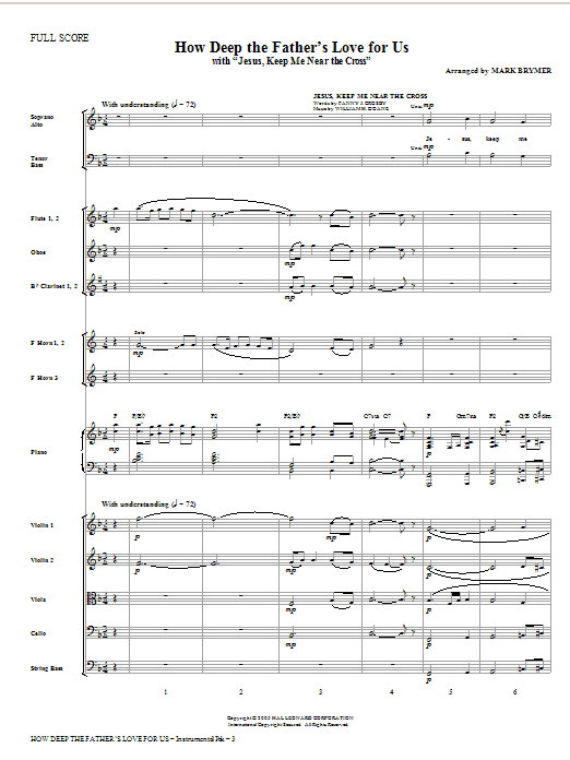 The contemporary worship classic is interwoven with the treasured American folk hymn Jesus, Keep Me Near the Cross in this gentle, yet dynamic ballad setting. Easily learned, it offers a special message of the depth and strength of God's love. Available for SATB, SAB and SSA. Instrumental ePak available. Instrumentation: Flute 1, 2; Oboe; Bb Clarinet 1, 2; F Horn 1, 2, 3; Violin 1, 2; Viola; Cello and String Bass. ChoirTrax CD also available. Performance Time: Approx. 3:50