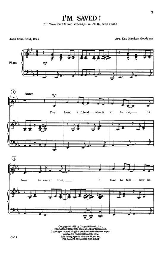 The author and composer of this hymn, Jack Scholfield, was a singing evangelist. 'I'm saved' speaks to the joy of salvation. It's happy mood and medium easy vocal technique makes it suitable for middle and high school choruses.