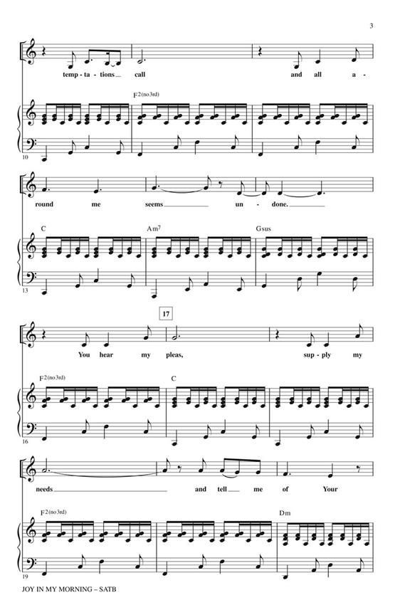 When darkness calls, temptations call, and all around us seems undone - God hears our pleas, supplies all our needs, and tells us of His wonderous love. He is the joy in our morning! Available separately: SATB, CD Accompaniment Trax, Orchestration. Duration: ca. 3:40.